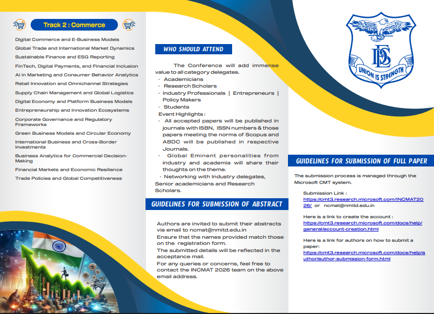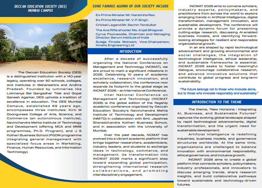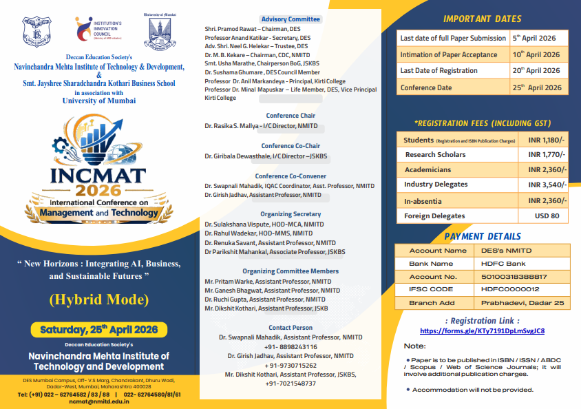 After a decade of successfully organizing the National Conference (NCMAT), Deccan Education Society’s NMITD, in collaboration with Smt. Jayshree Sharadchandra Kothari Business School and the University of Mumbai, is proud to mark a significant milestone in 2026. Celebrating 10 years of academic excellence and research innovation, our flagship conference now expands its footprint to the global stage as INCMAT 2026. Backed by the 140-year legacy of the Deccan Education Society, we continue our tradition of excellence by fostering international research collaborations and promoting interdisciplinary engagement.